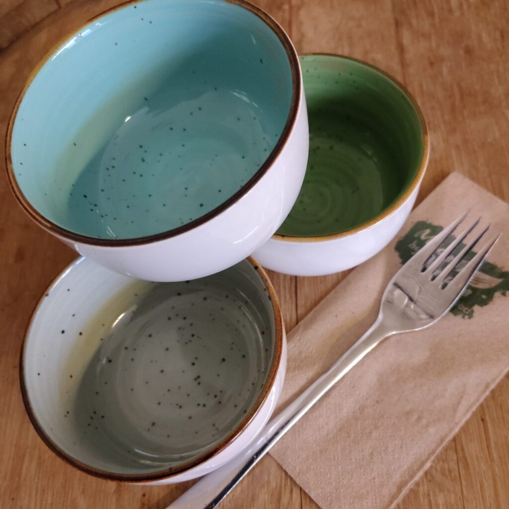Salatschalen (10 cm Durchmesser und 5 cm Höhe) und Gabeln. Inklusive Reinigung.