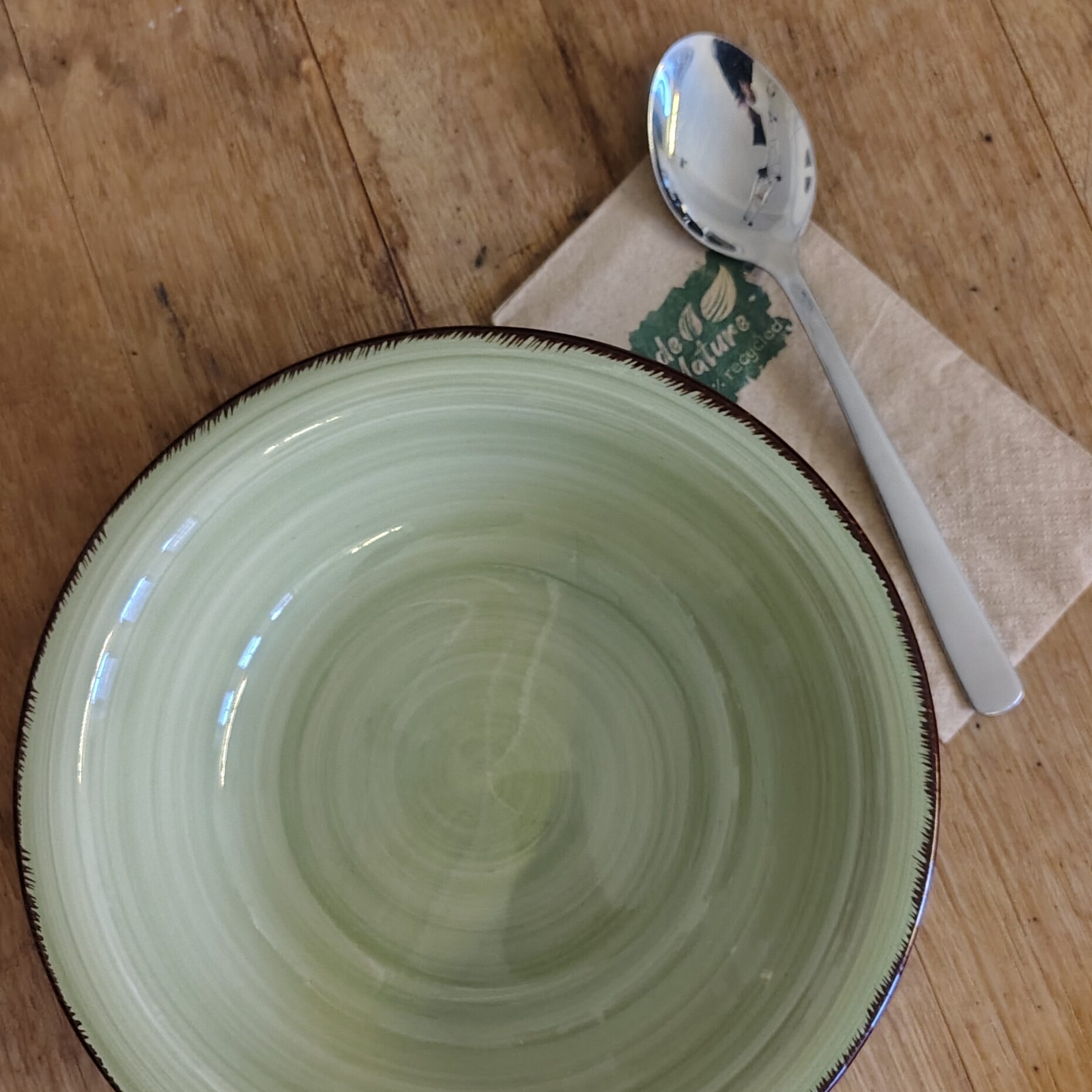 Große Suppenteller (21 cm Durchmesser) und Löffel. Inklusive Reinigung.