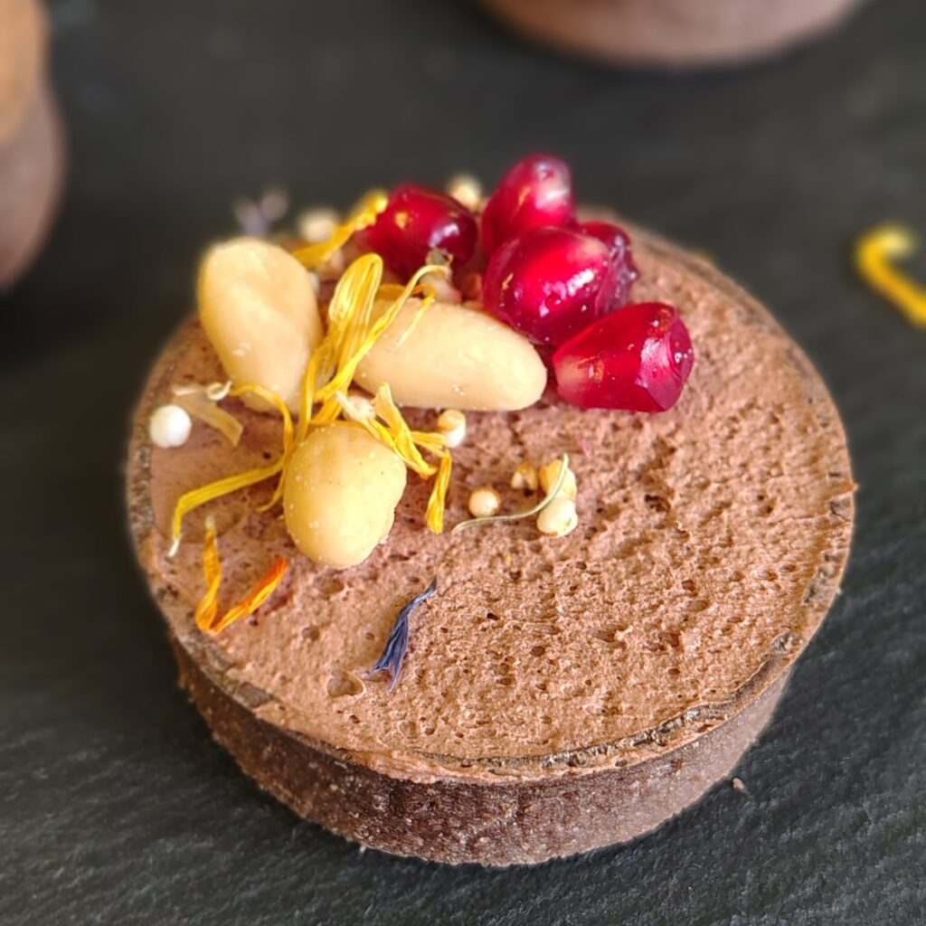 Dunkles Schokoladenmousse mit Fruchtkompott; ausdekoriert mit Creme und Obst.