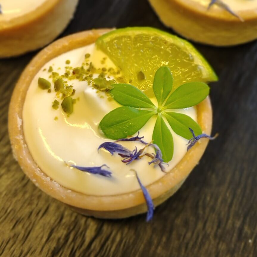 Mini-Tartlette mit Zitronenfüllung und Vanillecreme.
